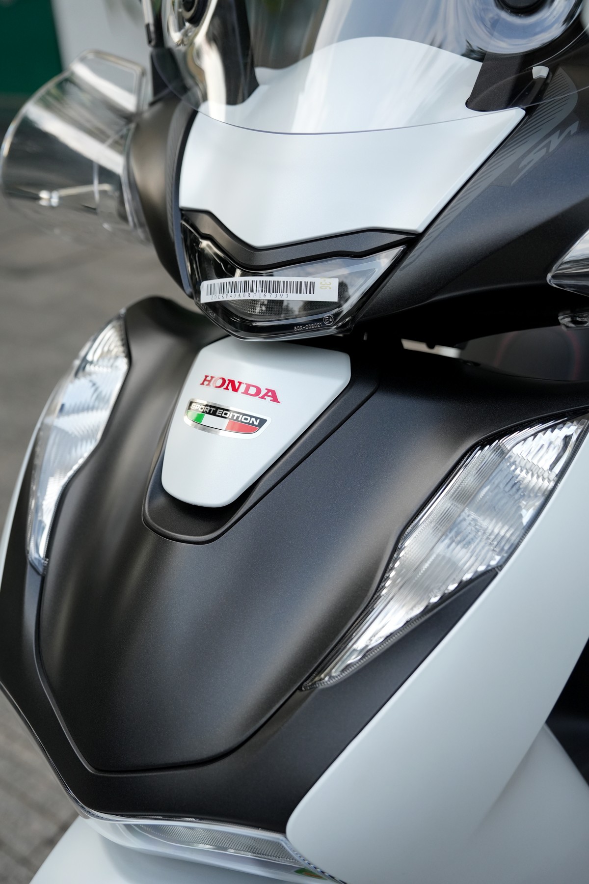 Góc trực diện với logo Honda màu đỏ và tem Sport Edition với 3 màu sắc